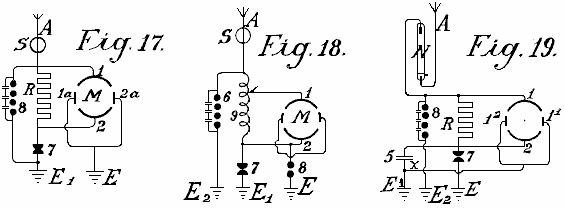 Fig.19 zeigt eine andere Methode, die hochfrequente elektromagnetische Schwingungen im Schwingkreis gebildet verhindert, Bereich zurück zu der Antenne. Es basiert auf dem bekannten Prinzip, daß eine Quecksilberlampe, eine Elektrode mit Quecksilber gebildet ist, das andere aus massivem Metall, wie Stahl, kann eine elektrische Ladung, um in nur einer Richtung durch: aus dem Quecksilber in dem Stahl und nicht umgekehrt. Das Quecksilber-Elektrode des Vakuumrohrs N ist daher mit der Luftleiter und dem Stahlelektrode mit dem Schwingkreis verbunden ist. Ladungen können dann nur von der Antennenpass durch die Vakuumröhre mit der Schwingungsschaltung und keine Strömung auftritt, in entgegengesetzter Richtung. In der Praxis müssen diese Röhren hinter einem Elektromagneten wie letztere allein bietet keinen Schutz vor der Gefahr von Blitz angeschlossen werden.