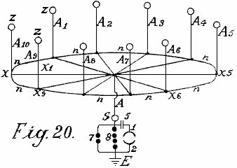 Fig.20 zeigt eine der einfachsten Formen der Konstruktion eines Antennennetzes in Kombination mit Kollektoren, Transformatoren und dergleichen. E ist der Erdungsdraht 8 das Sicherheitsfunkenstrecke 7 der Arbeitsfunkenstrecke, 1 und 2 die Ständerflächen des Motors 5 eine Kondensatorbatterie, S die Schutzmagneten, der mit der Spule in der Luftleiter verbunden ist A1-A10 Antennen mit dem Sammeln von Luftballons, N horizontalen Auffang oder Anschlussdrähte, aus denen eine Reihe von Verbindungen ins Zentrum laufen.