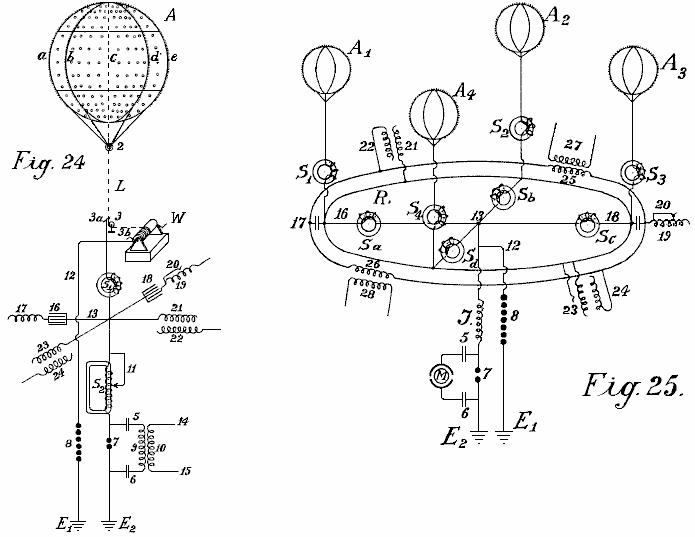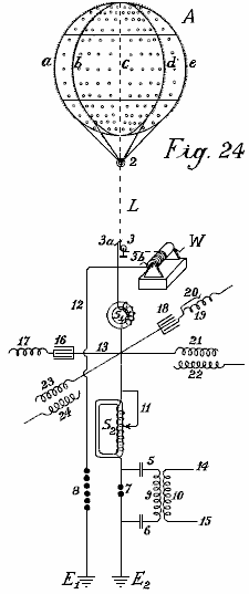 A ist die Sammelballon aus einer Aluminiummagnesiumlegierung (Elektronenmetall magnalium) mit einem spezifischen Gewicht von 1,8 und einer Plattendicke von 0,1 mm bis 0,2 mm. Im Inneren befinden sich acht starke vertikale Rippen T-förmigen Querschnitt von etwa 10 mm bis 20 mm in der Höhe und etwa 3 mm in der Dicke, mit der nach innen gerichteten Vorsprung (mit a, b, c angedeutet, d usw.). Sie sind miteinander vernietet, um eine feste Grundgerüst zu bilden, und sind in einer horizontalen Richtung durch zwei Querrippen versteift ist. Die Rippen sind ferner zueinander nach innen und in Querrichtung durch dünne Stahldrähte, wobei der Ballon erhält große Festigkeit und Elastizität verbunden. Gewalzten Bleche von 0,1 mm bis 0,2 mm in der Dicke magnalium Legierung hergestellt werden dann entweder gelötet oder auf diesem Gerüst, so dass ein vollständig metallisches Gehäuse mit einer glatten äußeren Oberfläche geschaffen vernietet. Nun versilbert oder verkupfert Aluminium beschichtete Stahldrähte von jeder Rippe an den Befestigungsring 2. Weitere, die verkupferten Stahltrosse L, vorzugsweise aus getrennten dünnen Drähten verdreht ausgeführt (als gestrichelte Linien in Fig.24 gezeigt) und die lang genug sein müssen, damit der Ballon in die gewünschte Höhe ansteigt, führt zu einer Metallwalze oder einer Riemenscheibe 3 und an einer Winde W, die auch von der Erde isoliert sein müssen. Mittels dieser Seilwinde, der Ballon, der mit Wasserstoff oder Helium gefüllt ist, kann erlaubt werden, auf eine geeignete Höhe von 300 bis 5000 Meter steigen und auf den Boden für das Aufladen oder Reparaturen gebracht.