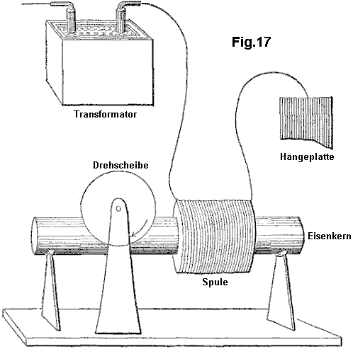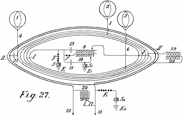 Der tatsächliche Strom wird direkt durch ein Reibungskontakt von der Metallwalze 3 oder von dem Draht oder sogar von der Winde gleichzeitig von allen drei mittels Bürsten ergriffen bzw. (3, 3a und 3b). Jenseits der Bürsten wird der Leiter unterteilt, die Wege sein: - zum einen über 12 für die Sicherheit Funkenstrecke 8, auf dem Schutzleiter E1, und zweitens über Elektro S1, Punkt 13, an eine zweite lose Elektromagneten mit einem einstellbaren Schrauben S2, dann zu der Funkenstrecke 7 und mit dem zweiten Erdungsleiter E2. Die tatsächliche Arbeitsstromkreis durch den Funkenspalt 7 ausgebildet, Kondensatoren 5 und 6 und durch die Primärspule 9; hier die statische Elektrizität durch oszillierende Entladung gebildet wird angesammelt und in hochfrequente elektromagnetische Schwingungen umgewandelt. Zwischen dem Elektromagneten S1 und S2 an der Kreuzungsstelle 13 sind vier Kondensatorsätze eingeführt, die nur schematisch in der Zeichnung durch einen einzigen Kondensator angedeutet sind. Zwei dieser Sätze von Kondensatoren (16 und 18) als Plattenkondensatoren durch Regulieren Induktionsspulen und längerer oder Spiralen 17 und 19, während die beiden anderen (21 und 23) sind Induktionskondensatoren. Wie aus den Zeichnungen ersichtlich ist, ist jeder der vier Kondensatorsätze 16, 18, 21 und 23 nur einen Pol verbunden ist, um entweder die Antenne oder an den Kollektor Leiters. Die zweiten Pole 17, 19, 22 und 24 sind offen. Im Fall von Plattenkondensatoren, die keine induktive Widerstand ist eine Induktionsspule eingesetzt ist. Die Aufgabe einer solchen Spirale oder Spule ist die Verschiebung des Phase des Induktionsstrom um 1/4 Perioden, während der Ladestrom des Kondensators Pole, die in der Luft frei liegen, und so zu dem Kollektorantenne. Die Folge davon ist, dass bei elektrischen Entladungen in den Kollektor-Antenne, ermöglicht die Rückinduktionswirkung der freien Pole eine höhere Spannung in der Seilsammelleiter aufrechterhalten, als es sonst der Fall wäre. Es wurde auch festgestellt, dass eine solche Rück Aktion hat eine äußerst günstige Wirkung auf die Abnutzung der Kontakte. Natürlich können auch die induktive Wirkung wird innerhalb der Grenzen der Grße der Induktionsspule geregelt werden, wobei die Länge der Spule in Aktion einstellbar mittels Drahtverbindung ohne Induktion (siehe Fig.24 No. 20).