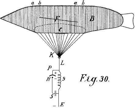 Es wurde nun gefunden, dass, wenn die Netzwerkleiters, welche die Luftsammler Ballons miteinander wird nicht als eine einfache Ringleiter hergestellt, vorzugsweise aber in Form von Spulen über einen Kondensator eingestellt oder Funkenstrecke oder durch thermionische Ventile kurzgeschlossen, dann ist die Gesamtfangnetz zeigt ganz neue Eigenschaften. Die Sammlung der atmosphärischen Elektrizität ist dabei nicht nur erhöht, sondern ein Wechselfeld kann leicht in den Kollektor-Netzwerk hergestellt werden. Ferner sind die atmosphärischen elektrischen Kräfte zeigt sich in den höheren Regionen kann auch direkt durch Induktion erhalten werden. In Fig.26 und Fig.28 ist eine Konstruktionsform gezeigt, auf deren Grundlage die weiteren Grundlagen des Verfahrens werden detaillierter erläutert werden.
