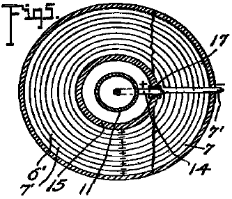 Fig.5 zeigt eine Anordnung zur Herstellung von großen Strömen, die ohne Motoren direkt verwendet werden kann, um Heizung und Beleuchtung. Der wesentliche Unterschied ist hier, dass die Funkenstrecke besteht aus sternförmige Scheibe 7, die um ihre eigene Achse drehen kann und von einem Motor gegenüberliegenden ähnlich ausgestattet Elektroden 7a gedreht. Wenn getrennte Punkte der Starts einander zugewandt sind, entlädt stattfinden, wodurch eine Oszillatorschaltung mit den Kondensatoren 5 und 6 und der Induktivität 9 ist ersichtlich, dass ein Motor kann auch direkt an den Enden der Spule 9 verbunden werden.