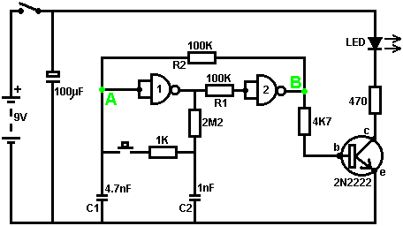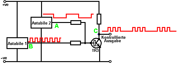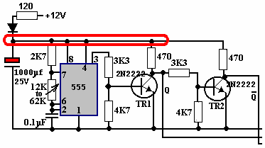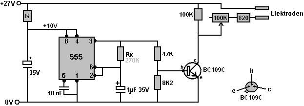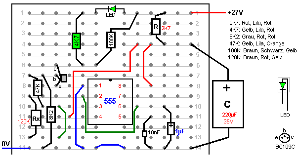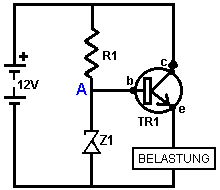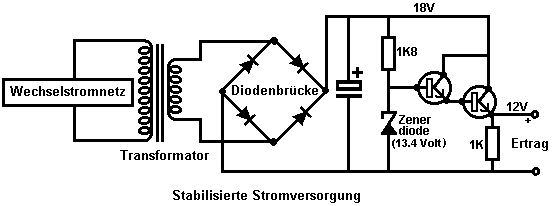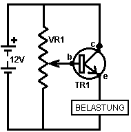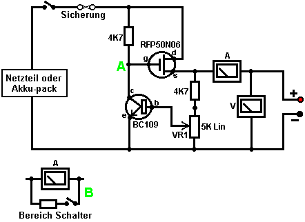 Die beiden Transistoren und drei Widerstände bilden eine einstellbare, stabilisierten Ausgang. Der FET-Transistor eine hohe Ausgangsleistung Belastbarkeit und eine sehr geringe Eingangsleistung Anforderung und so gut für die Regelung der Ausgangsspannung. Widerstand 'VR1' mit dem Widerstand 4K7 aufgefüllt ausschließlich um die Spannung über den variablen Widerstand zu verringern. VR1 eingestellt wird, um die Ausgangsspannung zu steuern. Wenn die Stromaufnahme erhöht wird und die Ausgangsspannung wird etwas nach unten gezogen, so wird die Spannung an der Basis des Transistors BC109 reduziert wird. Dies startet, um den Transistor auszuschalten, Erhöhen der Spannung am Punkt 'A', was wiederum erhöht die Ausgangsspannung, gegen die Variation durch die Last verursacht.