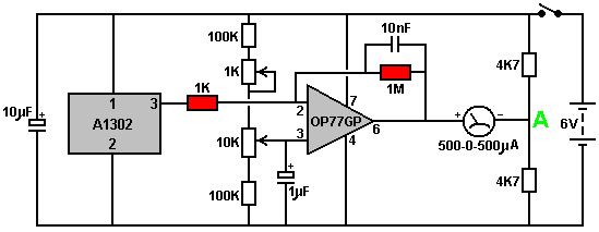 Diese Konstruktion verwendet einen OP77GP Operationsverstärkers Chip, um das Ausgangssignal von der A1302-Chip, der eine Hall-Effekt-Vorrichtung ist zu steigern. Die Verstärkung des DC-Operationsverstärkers verbunden ist durch das Verhältnis der 1K und 1M Festwiderständen gezeigt im Schaltplan schattiert gesetzt, was eine Verstärkung von 1.000.