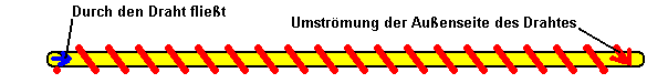 Trotzdem, wenn die Ein/Aus-Schalter einer Schaltung auf umgedreht, die Schaltung schaltet sich sofort, egal wie lange die Drähte. Der Grund dafür ist, dass elektrischer Strom entlang der Drähte mit sehr hoher Geschwindigkeit in der Tat, aber es fließt schnell entlang der Außenseite der Drähte, nicht schnell durch die Drähte. Einem Tausendstel einer Sekunde nach Einschalten eines Stromkreises, haben die Elektronen fließen durch die Drähte kaum angefangen hat, während der Strom, der entlang der Außenseite der Drähte hat der ganzen Schaltung und zurück gegangen: