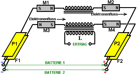 Es wird vorgeschlagen, dass ein Elektron nicht nur als negativ geladenes Teilchen, sondern auch als Südpol anzusehen. Die grundlegende Stromerzeuger Element ist, dass aus einem offenen Sekundärkreis, Kapazität geladen wird, induktiv mit einer Primär-Schaltung gekoppelt ist. Der Roman ist auch, dass die Kapazitäten an den sekundären Kern durch Permanentmagneten verbunden wie hier gezeigt:
