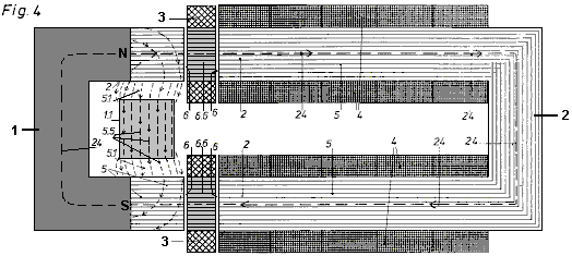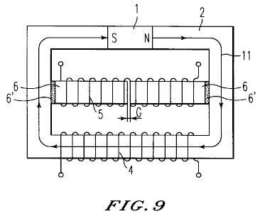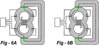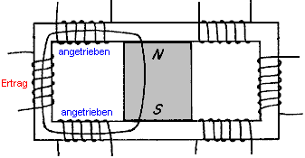 Hier weist ein laminiertes Weicheisen Rahmen einen starken Permanentmagneten in seiner Mitte positioniert und sechs Spulen werden in den gezeigten Positionen gewickelt. Der magnetische Fluß von dem Dauermagneten fließt, um beide Seiten des Rahmens.