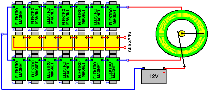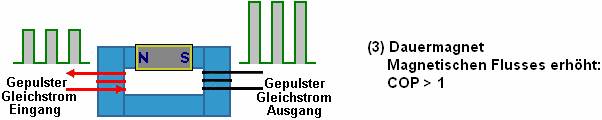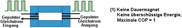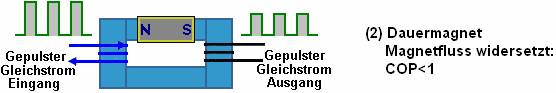Wenn jedoch die Eingangsspule gepulst ist, so daß der Strom in der Spule ein Magnetfeld, welches das Magnetfeld des Permanentmagneten verstärkt produziert dann ist es möglich, die Ausgangsleistung der Eingangsleistung zu überschreiten. Die "Coefficient of Performance" oder "COP" des Gerätes ist die Menge der Leistung um den Betrag der Eingangsleistung, die der Benutzer zu setzen in, um das Gerät zu betreiben unterteilt. In diesem Fall kann der COP-Wert größer als eins sein: