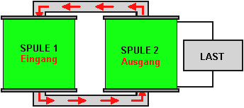 Wenn ein Impuls des Eingangsleistung an die Spule 1 zugeführt (bezeichnet als "Primärwicklung"), erzeugt er eine magnetische Welle, die sich um den Rahmen oder "Joch" des Transformators spielt dem Passieren Spule 2 (die sogenannte "Sekundärwicklung") und zurück zum Spule 1 wieder, wie durch die blauen Pfeile dargestellt. Dieser magnetische Impuls erzeugt ein elektrisches Ausgangssignal in Spule 2, die durch die elektrische Last (Beleuchtung, Heizung, Batterieladung, Videoanzeigen oder was auch immer) die es mit der Kraft, die es braucht, um arbeiten fließt.