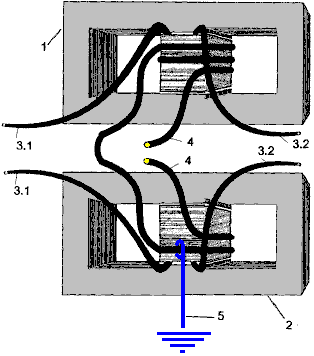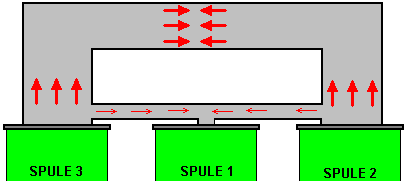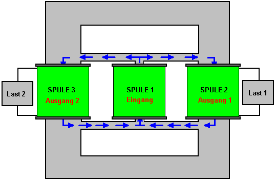 Davon ausgehen, dass Spule 2 und Spule 3 identisch sind. Der umgekehrte magnetische Fluss von Spule 2 kommt sofort begegnet einer Kreuzung mit einem Weg als viel einfacher, als die anderen zu verwenden. Als Ergebnis wird die überwiegende Mehrheit dieser Magnetfluss folgt dem erweiterten Weg und nur ein kleiner Anteil durch den schmalen Weg strömt. Der breite Weg Fluss trifft und wird von einer identischen großen Fluss aus Spule 3 gegenüber, und diese Stromflüsse effektiv gegenseitig aufheben. Dies ergibt eine wesentliche Verbesserung gegenüber einem gewöhnlichen Transformator. Aber die kleinen Strömungs zum Eingang von Spule 1 Begegnungen zwei identische Wege, und nur einer dieser Pfade geht der Spule 1, so daß der Fluß teilt mit der Hälfte in Richtung Spule 3 und die Hälfte geht durch die Spule 1, dass die Stärke der Hälften bereits kleiner Prozentsatz der ursprünglichen, unerwünschte Rückwärtsmagnetfluss in die Spule 1. Die andere Hälfte läuft in den reduzierten Strömungs von Spule 3 und jenen Hälften gegenseitig aufheben. Der Gesamteffekt ist eine sehr große Verbesserung in der Leistung des Transformators als Ganzes.