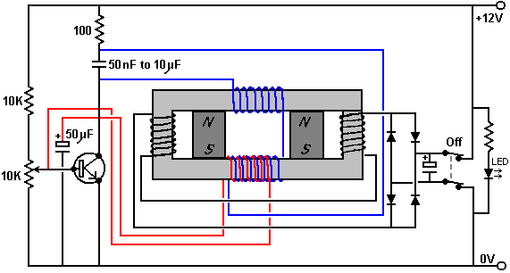 Es gibt eine Grenze, dies als die Menge des magnetischen Flusses, die eine bestimmte Frame übertragen kann durch das Material, aus dem er hergestellt ist bestimmt. Eisen ist das am häufigsten verwendete Material für Rahmen dieser Art und es hat eine sehr bestimmte Sättigungspunkt. Wenn der Permanentmagnet ist so stark, dass es die Sättigung des Rahmens Materials bewirkt, bevor die Eingabe pulsierenden angewendet wird, dann kann es keine Effekt überhaupt von positiven Wechselstrom pulsierend wie gezeigt. Dies ist nur der gesunde Menschenverstand, aber es macht deutlich, dass der Magnet ausgewählt darf nicht zu stark sein für die Größe des Rahmens, und warum das so ist.