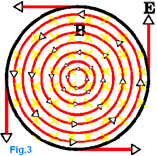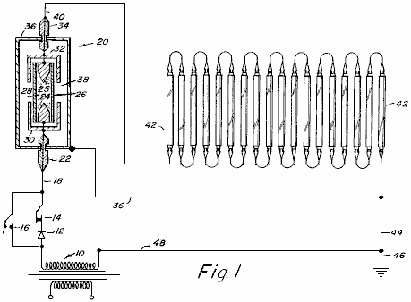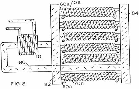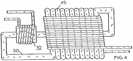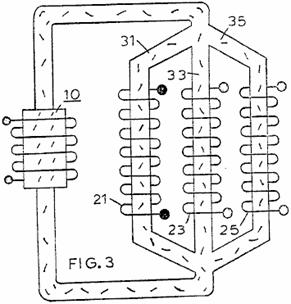 Lawrence Bemerkungen zu drei möglichen Anordnungen. Das erste auf oben gezeigt ist die handelsübliche Transformatoranordnung, wo es ist ein Rahmen aus isolierten Eisen-Scheiben hergestellt, um hieb die "Wirbel" Strömungen, die sonst zirkulieren innerhalb des Rahmens im rechten Winkel zu den nützlichen magnetischen Pulsen, die die Links würde zwei Spulen an den gegenüberliegenden Seiten des Rahmens. Als sehr allgemein bekannt ist, diese Art der Anordnung niemals eine Ausgangsleistung größer als die Eingangsleistung.