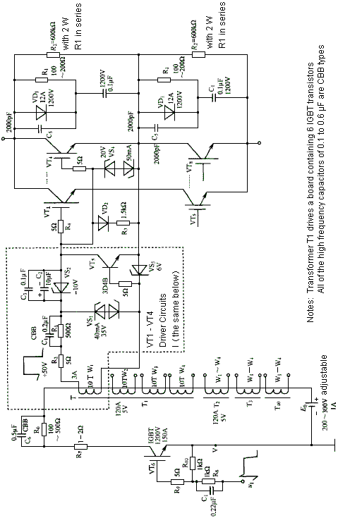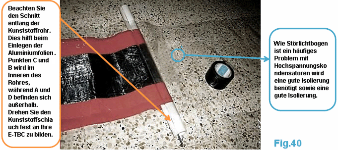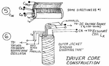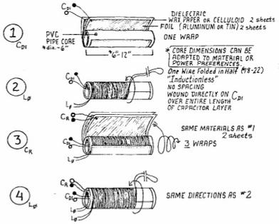 Fig.3 oben zeigt, wie der Zentrum-Treiber "Kern" aufgebaut ist. Es gibt sechs grundlegende Schritte zum Konstruieren der Treiber "kern" Assembly. Zuerst beginnen Sie mit dem PVC-Rohr gezeigt und beginnen Sie, Umhüllung des ersten Kondensators CDI. Schritt 2 zeigt die erste Induktions-weniger Spule L1. Beachten Sie, dass für die weniger-Induktion Spule, der Draht "gefaltet" zurück ist und die beiden Dirigenten zusammen Wunde sind, wie gezeigt. Diese Spule ist Single mit #18 bis #22 Gauge Wire (1,024 mm 0,644 mm Durchmesser) gewickelt. Schritt 3 zeigt den Zentrum Kondensator Cr. Dieser Kondensator wird auf die gleiche Weise als der vorherige Kondensator erstellt, außer dass es drei Ebenen Kurven hat. Schritt vier veranschaulicht die zweite Induktions-weniger-Spule, die in die gleiche Richtung wie die erste Spule gewickelt ist. Diese zweite Spule Lo ist Single Layer. Schritt 5 ist der letzte Kondensator CDE, die besteht aus einer einzigen Packung und ist in die gleiche Richtung wie die zwei vorherigen Kondensatoren gewickelt. Der letzte Schritt, sechs, wickeln Sie die gesamte Baugruppe mit strapping Klebeband um einen Mantel nach Abschluss bilden soll.