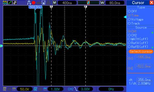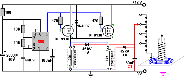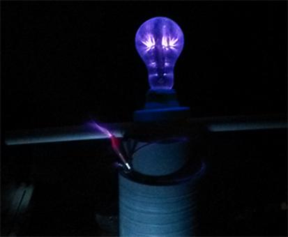 Da es einige Puristen stört, vielleicht sei erwähnt, dass, während eine Rechteckwelle Eingangssignal an den Eingang jedes der obigen Abbildungen angelegt wird, wird der Ausgang nicht ein Rechtecksignal sein, obwohl es so zur Klarheit gezeigt ist. Stattdessen wandeln die Eingangs-und Ausgangsspulen der Rechteckwelle an einen niedriger Qualität Sinuswelle die erst ein reiner Sinus, wenn die Pulsfrequenz exakt der Resonanzfrequenz der Ausgangswicklung. Das Oszilloskop angezeigt hier ist eine typische Ausgangsleistung Wellenform, die fast 390.000 dieser Impulse hat pro Sekunde.