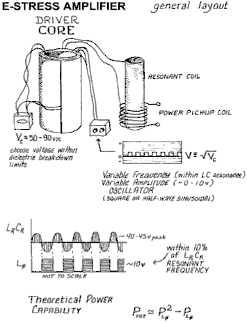 Fig.1 zeigt das allgemeine Layout des gesamten E-Stress Power Systems. Dieses Diagramm zeigt die Treiber-Core und der Variable Frequenz-Oszillator bestimmt die Tank-Schaltung-Resonanz. Abb. 1 zeigt auch die Gleichstrom Energiequelle von etwa 50 bis 90 Volt, die zunächst den "Kern"-Kondensator CDI Gebühren / CDE. Auch in diesem Diagramm gezeigt ist die Resonanz Spule und Macht Ausgabe Spule.
