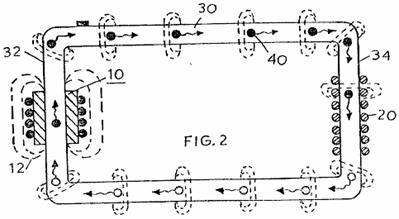 In der vereinfachten Ausführungsform in Fig.1 und Fig.2 sowie den anderen genannten bevorzugten Ausführungsformen gezeigt, wurde gezeigt, dass eine niedrige Spannung an den Teilchenbeschleuniger 10 aufgebracht wurde. Beim Beschleunigen, würde eine hohe Spannung / Strom in der sekundären Ausgangsspule 20 induziert werden. Eine am meisten signifikanter Vorteil der vorliegenden Erfindung ist, dass die Spannungsverstärkung nicht auf die Form der Wellenform der Eingangsspannung verbunden. Insbesondere wenn der Eingang Gleichstrom eine Gleichstrom-Spannung ausgegeben. Ein Wechselstrom-Eingang produzieren einen Wechselstrom-Ausgang. Gepulster Spannungseingang erzeugt eine gepulste Ausgangsspannung und eine Eingangsspannung von einer anderen Konfiguration wird ein Ausgangssignal mit derselben Konfiguration zu erzeugen, dass.