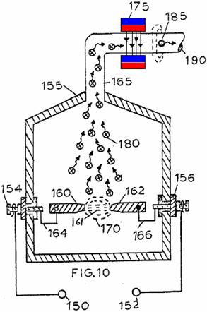 Elektroden verdampft, Herstellung von Partikeln 180. Diese Partikel steigen und geben Rohr 190, die durch ein Magnetfeld-Generator 175. Das gibt jedem Teilchen eine magnetische Ladung und sie weiterhin