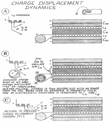 Fig.8 oben, erläutert die kostenlos Verschiebung Dynamik der E-Stress-Verstärker-Power-System beteiligt. Abbildung A zeigt die Induktion-weniger Spule-Lo-Wellenform. Abbildung B zeigt die Vertriebenen kostenlos-Spins, wenn die Spannung und die aktuellen Aufschwung als die Induktion-weniger Windungen gepulst sind, während Diagramm C die Wellenform während der Rückkehr in die vorherige kostenlos-Muster zeigt, beginnen die zyklisch immer wieder.