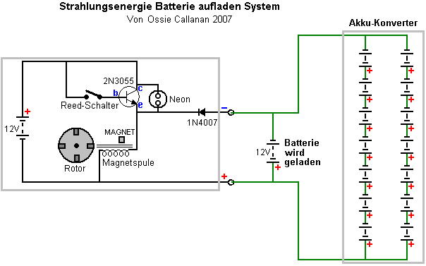 Die jüngste Ladesystem von 'UFOpolitics "im Kapitel 3 gezeigt, eine sehr gute und einfache Ladeverfahren die kalte Strom verbraucht. Dies kann zu überwinden die bisherigen Einschränkungen durch Verwendung von Batterien, wahrscheinlich sowohl in Bezug auf Stromverbrauch und in Bezug auf Ladezeit verhängt. Die Electrodyne Corp Personal extensiv mit dem Tesla Schalter Schaltung experimentiert, gefunden, dass, wenn eine Batterie voll wurde verwendet kalten Strom bedingt ist, dass eine Batterie getrennt werden konnte, unabhängig auf seine volle Kapazität entladen wird, und dann vollständig in unter einer wieder aufgeladen Minute. Dieser Stil der Operation vollständig überwindet die Einwände gegen Akkubetrieb Banken an die Macht Hausrat aller Macht.