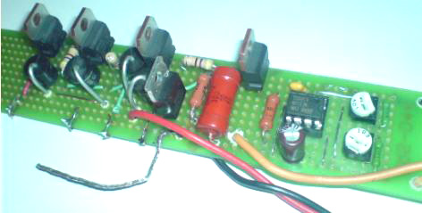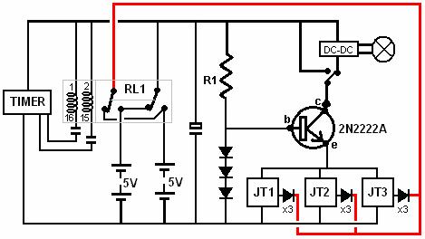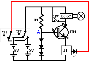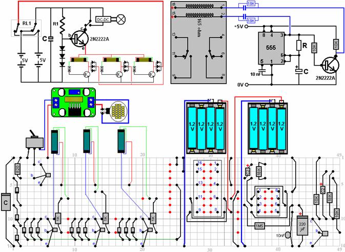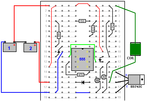 Drei-Joule-Thief-Konstruktion, wobei ein Stück einer Streifenplatte von 125 x