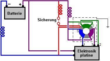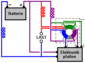 Spannung in allen drei Wicklungen. Der Magnet auf dem Rotor wirksam