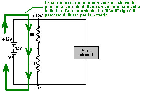 un circuito elettrico, la batteria forza una corrente attraverso i fili del