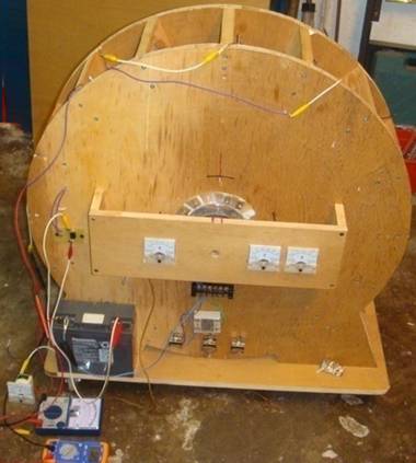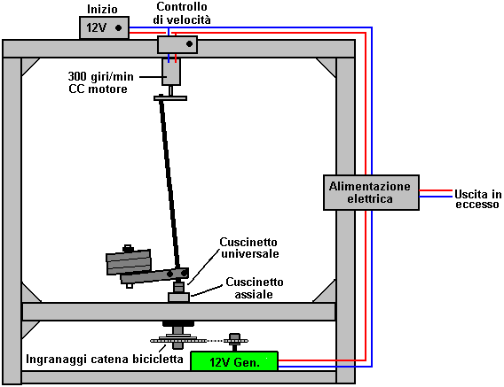 A questo punto, può essere montato il motore 300 rpm con braccio attuatore su esso e la casella di controllo della velocità. Il motore si trova in posizione centrale, e la casella di controllo può essere posizionata ovunque conveniente. La casella di controllo è semplicemente un pacco di batterie da 12 volt di 1.2 v batterie AA NiMh collegato tramite un interruttore a pulsante push-a-fare stampa e il commerciale CC motore regolatore di velocità, il motore 300 giri/min. Con questa disposizione, il motore può essere alimentato da premendo il pulsante e regolando la velocità lentamente fino da fermo, ottenendo il peso del rotore in movimento gradualmente più veloce e più veloce fino a raggiungere la sua velocità operativa migliore. Quando tutto è a posto, l'output rettificato dell'alternatore è alimentato nella casella di controllo, che può essere rilasciato il pulsante Start e del dispositivo Diventa autoalimentato da parte della potenza di uscita. Il passo iniziale assomiglia a questo: