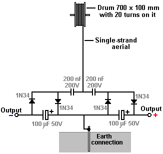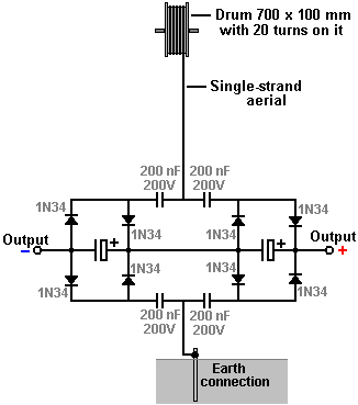 There is nothing magic about free-energy and by “free-energy” I mean something which produces output energy without the need for using a fuel which you have to buy. Free energy devices have been around for a very long time now. I have stood beside a water mill and it’s power is scary as it could crush you in moments and never even notice. That mill is on a quietly flowing small river and it can operate at any time day or night without having to pay anything for the power which it uses. It will have cost quite a bit to build the mill in the first place, but after that, it produces major power year after year. Most free-energy devices are just like that as it costs to build them in the first place, but after that they run for free. This presentation is mainly for people who have never come across free-energy and know nothing about it. So, each chapter deals with just one device and tries to explain it clearly. We come now to the practical and useful aerials used by Jes Ascanius, a Danish developer, to whom thanks is due for sharing his design. Initially, he set up a system to charge his mobile phone battery overnight from an aerial. Let’s start with the very simple system and progress from that to more powerful arrangements. The initial circuit uses one strand of solid wire which rises vertically to a 700 mm diameter drum where there are some twenty turns. The arrangement is like this: ![]() The aerial wire is several metres long, and in the prototype, was supported by (and insulated from) the eaves of a house. The aerial should be vertical or near vertical and a proper earth connection provided by driving a metal rod into the ground or connecting a wire to a metal plate and burying the plate in the ground as a good electrical connection is needed here. The earth connection used here is a 12 mm copper pipe 3 metres long, driven into the ground and the ground around it saturated with water: ![]() The wire used to connect with the earthing rod is very important and should not be less than 8 swg copper wire, that is, 4 mm diameter and 13 sq. mm. cross-sectional area. With this free-energy device, this is an important detail as are the diodes used which are germanium 1N34 or 1N34a which are particularly suited to this application due to their very low voltage drop. For the 200 nF capacitors, ceramic disc types are recommended. The prototype build used two large scavenged capacitors and it looks like this: ![]() ![]() Now, consider this circuit as described, to be one modular building block which can lead to serious power being drawn from an aerial. I will represent the circuit shown above as a rectangle, showing the above circuit as: ![]() While it is possible to use more than one module with the aerial to get more power, the Danish developer then switched to a more advanced arrangement by attaching a 600 x 800 x 2 mm aluminium plate inside the sloping roof of his house: ![]() The plate being suspended using nylon cord to prevent it touching the roof or anything else: ![]() The plate is positioned between 3 and 3.5 metres (10 to 12 feet) above the ground and the attachment to the plate is also heavy-duty 8 swg cable: ![]() The cable is connected to the aluminium plate using a brass bolt and nuts which the builder thinks may be significant, quite apart from avoiding any galvanitic connection to the circuit. The cable is then run vertically downwards to the circuit. For this arrangement a second earthing point is also used. This is a galvanised iron pipe 3 metres long, driven vertically into the ground which is saturated with water. The second earth is 2 metres away from the first earth and there is no known significance in the use of an iron pipe as it was used because it was to hand at the time.. This arrangement provides serious power, enough to cause injury to, or kill a careless human. With two modules, it will light an LED very brightly, driving it to 2.6 volts. If the LED is removed, then the voltage climbs to about twenty volts and is easily sufficient to charge a 12V battery or battery bank although that takes time. With twenty modules a 12V battery can be charged over night. It is estimated that with two hundred modules, the power would be sufficient to power a household although that has not yet been done. It should be borne in mind that each module is easy and cheap to make, so arranging for a stack of them where additional modules can be added at a later date for more power, is an ideal arrangement. The circuit is like this: ![]() This circuit looks completely mad as the aerial input to the circuit appears to be directly short-circuited by the first earth connection. In spite of this, the circuit works very well when connected this way. Additional modules can be added without any known limit. Increased power can be had by either raising the aluminium plate higher above the ground, to say, 10 metres (33 feet), or by adding one or more additional aerial plates. As you have a good aerial connected through to a very good earth, there has to be the possibility of the equipment being hit by lightning, and so it is recommended that a protective spark-gap is installed between the aerial and the earth, close to the circuit, so that if high-voltage is suddenly applied to the aerial, the spark gap will fire and shunt the excess power through to the earth. Alternatively, possibly a better solution is to install a standard lightning rod system a few metres away from the aerial and a metre or two higher up, so that it forms a more attractive point for a lightning strike. Further experimentation has shown that altering the connection point for the aerial has a significant effect on the results. If the connection is made at the mid point between the aerial plate and the earth connection, it produces a greater output: ![]() With this arrangement a single module produces around 30 volts while the original method of connecting near the earth was giving about 26 volts with two modules. Jes Asca