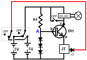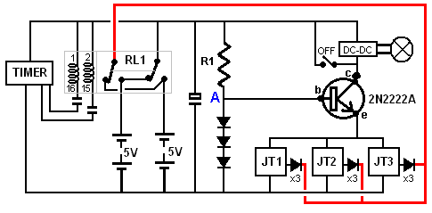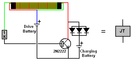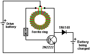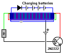 There is nothing magic about free-energy and by “free-energy” I mean something which produces output energy without the need for using a fuel which you have to buy. People are familiar with the concept of powering a light from a battery and then recharging the battery using a solar panel or a wind-powered generator. However, we really want to be able to recharge the battery when there is no daylight and no wind. What I personally would like is a light which shines whenever I switch it on and which uses a battery which I never have to recharge. While that sounds a bit far fetched, it is actually achievable if the battery is recharged when I am asleep. Let’s see what can be achieved using the knowledge which we already have. In the November 1999 edition of the magazine “Everyday Practical Electronics”, Mr Z. Karparnik showed one of the most simple and robust circuits ever produced. He called it the “Joule Thief” and originally it was intended to light a 3-volt Light-Emitting Diode using a dry cell battery which had been exhausted and run down to 0.5 volts or so. The Joule Thief circuit is very, very simple, using just one transistor, one resistor and one coil. Mr Karparnik wound his coil with just a short length of wire, making just a few turns on a tiny, scavenged toroid. The circuit looks like this: ![]() The circuit oscillates automatically and it generates a much higher voltage than that of the supply battery, and while it can most certainly light an LED which can’t be lit by the battery on its own, the circuit can do much more than that. It is not necessary to wind the coil on a ring as a simple paper cylinder is perfectly adequate, with a 1-volt battery generating a 19-volt output. The circuit was adapted by Bill Sherman to charge a second battery as well as lighting an LED. Bill adapted the circuit like this: ![]() I have used a circuit of this type (minus the LED) to charge a “1.2V NiMh” rechargeable battery of 2285 maHr capacity from 0.6 volts to 1.34 volts in just one hour. The drive battery started out with a voltage of 1.34 volts and ended up with a voltage of 1.29 volts (which is generally considered to be fully charged). We live in a massive energy field and so the extra energy flowing into the circuit came from the excess energy of our local environment. With a paper cylinder coil, the circuit is like this: ![]() The circuit has a minor weakness in that if the drive battery has a voltage greater than that of the charging battery plus the voltage drop across the diode, then the drive battery feeds current directly to the charging battery through the coil windings and we don’t want that to happen as it just wastes power. That weakness can be overcome by putting the batteries in series like this: ![]() A suitable coil can be wound quite easily. A pencil makes a good former for a coil, so a 100 mm or 150 mm wide strip of paper can be wrapped around a pencil to form a cylinder several layers thick and sealed with Selotape: ![]() Make sure that the paper is not stuck to the pencil and the cylinder is not so tight that it can’t be slid off the pencil when the coil has been wound. There is a wide scope for experimentation with the number of turns in the coil and the wire diameter used. I used 0.375 mm diameter enamelled solid copper wire. There are many different ways to wind a coil. The method which I used is to leave more than 100 mm of wire before the start of the coil and then make three or four turns like this: ![]() Then those few turns are held in place with Selotape before winding the rest of the coil in a single side-by-side layer using two wires to form a bi-filar coil. Then both ends are covered with electrical insulating tape because Selotape deteriorates as time passes. One single layer of wire is adequate, and finally, the coil is slid off the pencil. While the diagram above shows the two strands of wire in two colours, the reality is that both wires will be the same colour and so you end up with a coil which has two identical looking wires coming out of each end. Be sure to leave more than 100 mm of wire free at the finishing end before cutting the wire as you need that extra length of wire to make the circuit connections later on. Use a multimeter or a battery and LED to identify the two ends of one strand of wire and then connect the end of one wire to the start of the other wire. This is the central tap “B” of the coil: ![]() The coil needs to be checked carefully before use. Ideally, the central joint is soldered and if the wire is the “solderable” type, then the heat of the soldering iron will burn the enamel away after a few seconds, making a good quality soldered joint on what used to be enamelled wires. A resistance test needs to be carried out to check the quality of the coil. First, check the DC resistance between points “A” and “B”. The result should be between 1 and 2 ohms. Then check the resistance between points “B” and “C” and that should be exactly the same value. Finally, check the resistance between points “A” and “C”. That value must be higher than the “A” to “B” resistance but surprisingly, it is never twice the value in spite of the seeming impossibility of that. However, if the solder joint is very poor, then the resistance will be doubled or more and so the joint needs to be improved before the coil is used. The simple circuit shown above can charge four AA-size batteries in series when the circuit is being powered by just one AA-size battery. It is generally considered that using three diodes in parallel makes the circuit perform better but a single diode works perfectly well for me. There is a method of raising the circuit efficiency and that is to add a second bi-filar winding on top of the first one and taking the charging current from the second winding. This makes the circuit Lawrence Tseung’s “FLEET” circuit: ![]() Current drawn from the second winding does not affect t
