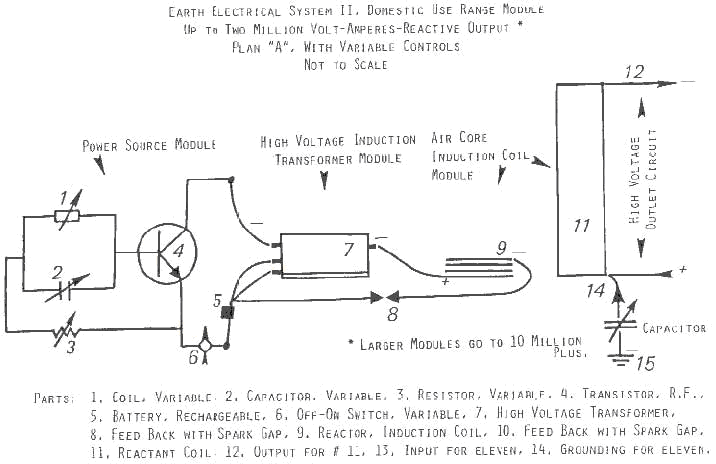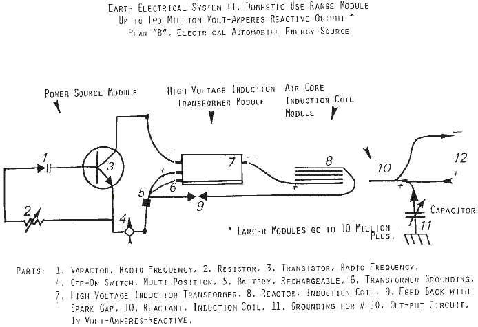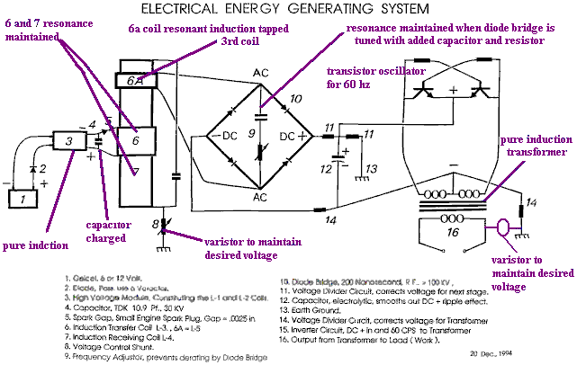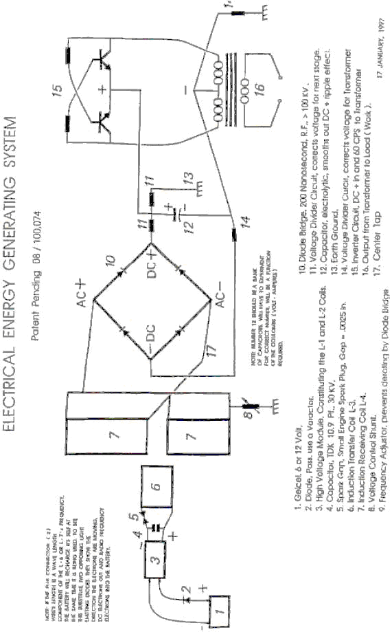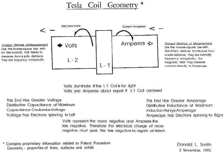 Donald L. Smith Energy Consultant Energy, energy everywhere and not a Joule to Jounce. Conventional wisdom, when properly tuned will appreciate the nature of energy, as here presented. The basic unit of electricity (the electron) upon encountering a moving magnetic field (or wave) spins, giving off an electric impulse. When this impulse collapses, it spins back to it's natural position, giving off a magnetic impulse. Therefore, magnetic and electric are two sides of the same coin. When the magnetic side is pulsed, it yields electricity and conversely, pulsing of the electrical side yields a magnetic field. Moving one in relation to the other produces useful energy. When done consecutively, each cycle pushes (current) forward, while pulling electrons into the system... in much the same way as a water pump moves water. These electrons are obtained from Earth and air grounding. The word "electric" comes from the Latin word electron "amber". When rubbed, amber develops an electrical charge, which can be transferred to a dissimilar substance. During the seventeenth and eighteenth centuries, a great deal of attention was centered on this attribute of amber. Amber was used to differentiate the non-metals. Carbon-related substances and other non-metals, when subjected to friction, give up negative electrical charges. On the other hand, metals when subjected to friction, simply conduct the charge. It is important to note that approximately 70% of the Earth's exposed crustal portions (surface) consist of silicone-related non-metals (electron donors) and become a direct source of electrical energy when properly agitated. Useful electrical energy can be obtained by grounding into the Earth's non-metal crust and into it's atmosphere as a natural source of electrons. These electrons have accumulated from the solar plasma during the aging of the Earth for more than 4.5 billion years, at a rate exceeding 3.9 exajoules per year This indicates that the Earth's electrical field contains in excess of 17.6 x 1018 of cumulative exajoules of energy. One exajoule is the approximate energy equivalent of 125 million barrels of oil. The electrical energy in one display of lightning is approximately ten trillion joules. During each 24 hour period, the land portions of Earth's surface yields in excess of 200,000 emissions, which involves more than 2,000 quadrillion watts. C.F. Gauss (1777-1855) and H.C. Oersted (1777-1851) were each separately trying to define the Earth's electrical field with all external influences removed. These external influences being solar-quiet periods and being remote from the land's surface. The air electricity background which they measured varies with latitude. Their European measurements correspond to approximately the latitude of Washington. D C. They were measuring magnetic field flux as an indicator of negative electron energy active and present. A related family of measurement are now presented. Units of measurement used to define flux fields include Gauss (one unit = 100,000 volts), Oersted (one unit = 50,000 volts), Tesla (one unit = 10,000 Gauss) and Gamma (one unit = 1/10,000 of a Gauss). Much confusion exists in electrical related publications about these units. As presented here they are correct with values taken from their original definitions. The entire surface of the Earth has been surveyed by aerial magnetometer, in most cases using gamma or nano teslas. One gamma is the magnetic flux equivalent of 10 active volts of electricity. When the data is corrected for flight height it becomes obvious that there are numerous areas where the gamma readings exceed one trillion gammas. Lightning strikes from the ground up are in that energy range. With knowledge of these electron enriched areas, the quality of Earth grounding, becomes enhanced. The correction necessary for land surface data when acquired from aerial magnetometer maps (using Coulomb's law) requires that the remote distance be squared and then multiplied by the remote reading. As an example, if the remote reading is 1,600 gammas and the flight height being 1,000 feet. Take 1,000 x 1,000 = 1,000,000 x 1,600 gammas = 1.6 trillion gammas x 10 volts = 16 trillion volts equivalent for land surface data. Present day methodology requires mechanical energy in exchange for electrical energy. Once obtained, this energy is subject to Ohm's Law. Present Methodology obtains it's electrical energy from it's non-metal and air groundings. This same energy can be obtained without the wasteful mechanical approach and at a much, much lower cost. Any required amount of electricity is available by resonant induction transfer from the Earth's magnetic and electrical fields. The major difference is in the functioning of Ohm's Law in relation to resonant circuits. In the resonant induction system suggested here, system resistance (Z) becomes zero at resonance. Therefore, Volts and Amperes are equal (V.A.R.) until work (load) is introduced. Each cycling of this resonant induction system pulls in additional electrons from the Earth's electrical field, generating electrical energy in any required amount. In this system, a small amount of electrical energy is used to activate and pull a much larger amount of energy into the system. This electrical advantage corresponds to the pulley and lever of the mechanical world. The electrical system presented here is extremely efficient. Using present methodology as a basis for comparison, with it's 60 cycles per second system. The resonant induction system, cycling at 60 million times per second produces one million times the energy which is produced by the present energy systems. A single small size unit of the resonant induction system has more usable electrical output than a major conventional unit. The radio frequency energy produced is easily changed to Direct Current, and then to the present 60 cycles per second system in preparation for commercial usage. The Patent Pending on this system is #08/100,