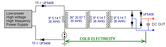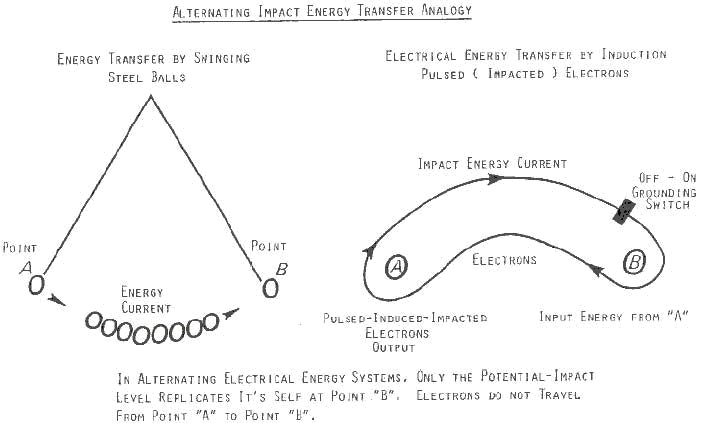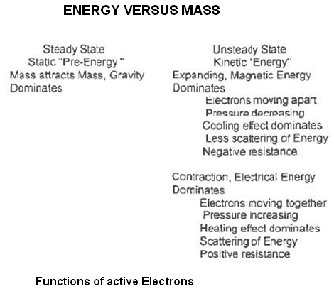 * Below 20,000 Cycles Per Second = Fields Above 20,000 Cycles Per Second = Waves (Radio Frequency) Analogous Relationships: 1. Potential Power is present in a bar magnet as shown: ![]() 2. The Source of these Electrons being from the Solar Plasma, are non-ionic and occupy all Free Space. They are commonly obtained from Earth and Air Groundings. They exist in Doublet Pairs, one being more negative than the other. The more negative one has a Left Hand Spin. The less negative one has a Right Hand Spin. 3. Resonate Electrical Coil Systems (Tesla ) are Analogous to the System observed in the Bar Magnet (above). The Bloch Wall Area is Located at the base of the L-2 Coil. The Left Spin portion of the coil (Voltage Only ) Coil predominates. The Right hand Spin portion of the coil (Magnetic-Amperage) is mostly absent. ![]() Collection and transfer of energy requires temporary storage, which occurs as capacitors and coils of a resonant circuit are cycled, on and off. The frequency at which the capacitors and coils are pumped, determines the amount of electrical energy that moves onward. The amount of Energy transferred relates directly to the density of lines of flux present. The Kinetic Energy Formula is helpful in establishing the amount of energy present. This formula squares the velocity times mass. In the case of electrical energy, the intensity of voltage and amperes multiplied by the cycles per second, replace the velocity component. Note that the "acceleration" of the Voltage "E" and Amperage "I", which increase as non-linear components, then obeys the Law of Squares. Each unit of increase, causes a squaring of the flux lines present. The amount of energy transfer caused by this increase in flux lines is demonstrated below. ![]() In resonant air-core coil energy transfer, the increase in flux lines present disturbs more electrons than previously, resulting in over-unity energy being present and available. Energy stored, times the cycles per second, represents the energy being pumped by the system. Capacitors and inductors store electrons temporarily. Capacitor formula: W = 0.5 x C x E x Cycles per second where: W = energy in Joules (Watt Seconds ) C = capacitance in farads E = applied potential in volts squared. Inductor (Coil) formula: W = 0.5 x L x I x Cycles per second where: W = energy in Joules (Watt Seconds ) L = inductance in henrys I = current in amperes squared Both one henry, and one farad, equal one volt. The higher the cycles per second, including the squaring of the flux lines, cause a large increase in the amount of energy being produced. The above combined with a resonant energy induction system (where all electrons are moving in the same direction at the same time), make the next move into over-unity practical. The dampening process of conventional electrical power generation, has all the available electrons bouncing randomly, mostly cancelling out each other. In that System, the useful energy available is a very small percentage of the energy which is present. In the resonant induction system, a very high percentage of the energy present is useful. At resonance, (ohms-impedance-Z) becomes zero and all of the energy present is not degraded and becomes available to do useful work. "Ohms" is load or wasted energy, and "amperes" is the rate of that wasting of energy. Using the previous information, if we now apply it to an air-core coil, resonant transformer energy system. L-1 and L-2 coils are now present. L-1 has a smaller number of turns and is several times the diameter of L-2. Input from a 12 volt high-voltage laser driver source, produces 8,000 volts with a low level of wasted energy, pushing amperage into, say, 4 turns of coil L-1. Each turn of the L-1 coil then acquires 2,000 volts of resonant potential. Consequently, each turn of L-2 is then exposed to the electric flux of 2,000 volts. Each turn at the bottom end of L-2 acquires 2,000 volts. The flux lines are squared and are additive as the voltage and amperage progresses towards the top end of L-2's large number of turns. A huge number of additional flux lines which were not previously present become present at the top end of the L-2 coil. These flux lines excite the nearby electrons in it's earth and air and groundings. This high level of excitement above the ambient, causes a large number of electrons which were not previously a part of the energy present, to become available for use. At this point over-unity is present in large amounts. The "bubble gum between the ears" response to this is: "this must be lots of volts but no amperes". Please recall that amperage is wasted energy, and that until that wasting occurs, there are no amperes. A good way to demonstrate this, would be to let the bubble gum crowd put their hands on the high-voltage end of the device while standing on wet ground (a people zapper). Note: don't do this. This over-unity device produces energy at radio frequencies which range into the megahertz band. This allows the device to be small in size, and yet produce large amounts of energy. A megawatt-sized unit will sit comfortably on a breakfast table. This energy is changed to Direct Current and then switched to produce the desired working frequency AC ![]() 1. Random movement of electrons in "A" and "B", mostly cancel each other out. This dampening, or wasteful concept of energy, is a source of much pleasure for the establishment. 2. "C" (Volt, Amperes, Reactive "V.A.R."), is the situation where all of the electrons move in the same direction at the same time. This results in near-unity energy output by resonant induction transfer. 3. Resonant induction transfer from one isolated power system, allows other resonant induction systems to duplicate the original source, which in no way diminishes the original source. Air-core coils (isolation-transformers) confirm this when they are a part of one of these functioning systems. A less perfect illustration would be the fact that the number of radio sets