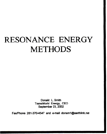 Description and Function: The Generation of Electrical Power requires the presence of electrons with various methods of stimulation, yielding magnetic and electrical impulses, collectively resulting in Electrical Energy (Power). In place of the mechanical - coils and magnet system, present in conventional electrical power generation, visible moving parts are replaced by resonate magnetic induction, using radio frequency. Transfer of energy by resonate induction is related to the ratio of the square of the cycles per second. The Energy System, presented here, operates at millions of cycles per second verses the conventional 60 C.P.S. This tells us that it has a frequency advantage over conventional methods. This same advantage applies to the amount of electrical energy output. Therefore the Device is small in size and produces large amounts of Electrical Energy. The Electrons acquired, are from the surrounding Air and Earth Groundings, being the same source as in conventional methods. This is accomplished by magnetic resonate radio induction. Applications: This Electrical System adapts nicely to all Energy Requirements. It is a direct replacement for all existing Energy Systems. This includes such things as Manufacturing, Agricultural, Home Usage, Office Complexes, Shopping Centers, Rail Transportation, Automobiles, Electrical Power Grids, Municipalities, Subdivisions, and Remote Areas. Briefly, the only limiting factor is the imagination. Economic Possibilities: No Historical Reference Point exists for a comparison of the Possibilities of this System. One can see from the impacted applications listed above, that the magnitude exceeds any known invention, presently a part of the Human Experience. Present and Future Plans: The Energy System has been in the developmental stage during the past seven years. It is Patent Pending # 08/100,074 with the Patent Office. No prior art exists according to the Patent Office's response. The System is presently being introduced into the World Market. Useful energy occurs as the result of imbalances in the ambient background energy, which is a transient phenomena. In the electrical field, it is a closed system subject to heat death, which severely limits it's utility. The flip side of the electron, produces magnetic waves which are an open system, not subject to heat death. These waves, being unrestricted, are the universal source of energy when unlimited resonate duplicates from this one source are available. Therefore, the key to unlimited energy, is Magnetic Resonance. In order to understand this, requires putting a stake through the Heart of Antique Physics. Non-linear and Open Systems are universally available in Magnetic Resonance Systems, Explosions of any sort [including Atomic Explosions] and Combustibles of any type. Mechanical equivalents would be levers, pulleys and hydraulics. A highly obvious example is the Piano where the Key impacts the one note giving one sound level, which resonates with it's two side keys providing a much higher sound level. Magnetic Resonance Energy clearly amplifies itself, demonstrating more energy out, than in. Ohmic resistance does not apply to Magnetic Resonance which travels unrestricted for great distances, therefore multitudes of electrons are disturbed, and their back-spin translates magnetic into usable electric energy. The right angle component which the magnetic flux provides, translates into useful electrical energy. Taken at right angles, the Magnetic Dipole provides an unlimited source of electrical energy. The writer is recognized world-wide for his knowledge and experience. See his Web Site at altenergy-pro.com . Gravity is a function of spin phenomenon as observed in gravity separation of liquids. When spun, milk and cream separate. Therefore, relative specific gravity is function of mass versus spin. Magnetics and gravity are both spin related. In part, a top levitates when spun. Therefore, spinning magnetic fields are a functional motor source as in flying saucers. ABSTRACT: Technology of New Energy: Developments in the understanding of Electricity, along with Materials which were not previously available, allows the construction of Devices which collect energy in large quantities, from the Earth's Ambient Electrical Background. This Energy is naturally occurring, environmentally benign and is available everywhere. It is available wherever and whenever it is required. New Devices use Resonate Magnetic Waves which replicate upon spinning the locally present electrons, providing multiple duplicate copies of the Energy Present. Each electron when spun yields both magnetic and electric waves in equal proportion. The electrical component is a closed system limited by Ohms Law. The magnetic component is an open system not limited and it replicates multiple copies of the energy present. Special materials and recent developments allow the magnetic energy to reproduce, through resonance, unlimited duplicate copies acquired from the ambient background. These Devices harvest the energy that has been, and is always present universally. Conventional methods consist of coils and magnets systems. Upon moving past each other, the magnetic flux field disturbs electrons which yield electricity, which is collected by the coils system. This is accomplished electronically with the new technology, without any moving parts and the energy is multiplied such that the Device becomes self-sustaining once it is started. This Technology, already presented Worldwide, will be shown at the Conference. Dr. Smith www.altenergy-pro.com e-mail donsml@earthlink.net "Putting a stake through the Heart" and thus removing the mental block created by antique physics is required. Conditions wherein this becomes necessary are non-linearity, resonance and explosions of any sort. Combustibles of any sort such gasoline and atomic explosions are good examples wherein more energy out than in, is obvious. You can add to that the non-linearity found