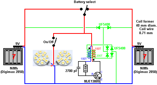 There is nothing magic about free-energy and by “free-energy” I mean something which produces output energy without the need for using a fuel which you have to buy. There has already been shown a Perpetual Light system where lighting batteries are recharged when the light is not in use. That design uses a latching relay to swap between two batteries on a continuous basis, but that tends to confuse some people and make the design seem too complicated. So, here is a design from our South African developer friend who shares his work freely and generously. He has daily mains power cuts which average seven hours per day and that brings into play the old saying that “necessity is the mother of invention”. He has built some of the earlier light design which uses a latching relay and those work very well, this one uses a tiny 12V to 220V inverter and a mains LED bulb: ![]() However, looking for an even more simple version has led to the following design which has few components and yet which works very well: ![]() As in the photograph above, the coil is wound on a white plastic pipe which has an outer diameter of forty millimeters. This is a modified Joule Thief circuit so the coil is started by winding two strands of 0.71 mm diameter enamelled solid copper wire. These wires are wound side by side (shown in red and blue in the diagram above). Each wire has 100 turns in this winding which places two hundred turns side by side on the pipe. If wound perfectly, 200 turns of 0.71 mm wire will cover a 142 millimeter length of the pipe, that is 5.6 inches. However, we need some spare space at each end of the coil, so we will need about 170 mm or 6.5 inches of pipe to make the coil. The length of wire in each of these two strands is about 13 metres, that is just under 50 grams in each strand. Having wound these first two strands of wire to form the Joule Thief bi-filar coil, we now wind a second coil on top of the bi-filar coil, using the same diameter wire. This coil is 200 turns of wire wound side by side in a single helix. This coils is shown in green in the above circuit diagram and requires about 26 metres of wire, that is just under 100 grams of wire. When winding a coil, always remember to leave sufficient length at each end of the coil to be able to make the circuit connections afterwards.. The circuit is very simple, being just two LED arrays providing 160 degree wide lighting when powered by a battery: ![]() With this arrangement either battery can be selected by the top switch and the light turned on or off using the lower switch. However, it is important to select the right components for every part of this circuit. AA size batteries are used. The batteries chosen are important because there is an enormous difference in battery performance when tested under an actual load, so pick Digimax 2850 batteries: ![]() Fourteen of these batteries are needed in order to have two sets of seven batteries in a slightly adapted battery box: ![]() Tests have shown that seven AA size batteries produce about nine volts and a 12-volt LED array draws only 33 milliamps of current and produces 209 lux of light at that tiny current draw. So using two of these LED arrays will draw about 66 milliamps and provide 418 lux of wide-angle lighting which one set of batteries can sustain for more than fifteen hours. However, that is not what we want to do. Instead we also power the adapted Joule Thief circuit and use it to recharge both batteries all of the time. However, a battery which is not providing current to a load, recharges much better than a battery which is providing current. You can, of course, switch the current draw from one set of batteries to the other, any time that you choose to do so, but let me stress that the circuit components shown here are important and you should not substitute alternatives as these components work well. We live in a massive energy field and we recharge the batteries by persuading that energy field to do it for us. This is accomplished by producing a series of voltage spikes. Those voltage spikes disturb the energy field and as it settles back down it feeds energy into our circuit. Please understand very clearly that the battery recharging is NOT done by the voltage spikes themselves but instead of that it is the inflow of energy from the surrounding energy field which does the recharging. The recharging is greatest if the voltage spikes switch off suddenly (and to a lesser extent switch on suddenly). For this, we use diodes which have a fast action, in this case UF5408 diodes as the “UF” stands for Ultra Fast. Take a look at the circuit: ![]() The best performance is when the transistor is a T13009 which is also sold under the name MJE13009. The 2700 pF capacitor is important as is the value of the 51K resistor. If you generally use the more basic series of resistors, then a 51K resistor can be a 47K resistor and a 3.9K resistor in series. The bridge of four UF5408 diodes can be replaced by am RS405L diode bridge if you prefer. Patrick Kelly http://www.free-energy-info.com http://www.free-energy-devices.com http://www.free-energy-info.tuks.nl |