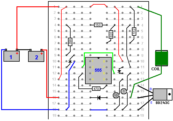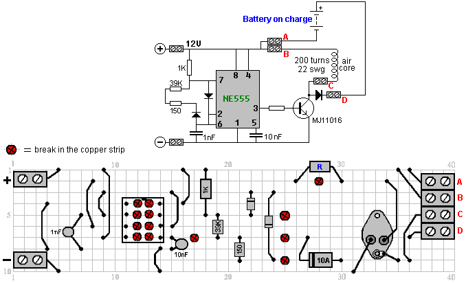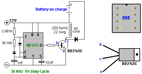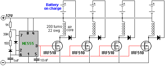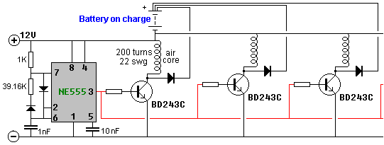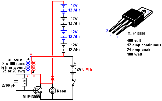 There is nothing magic about free-energy and by “free-energy” I mean something which produces output energy without the need for using a fuel which you have to buy. Free energy devices have been around for a very long time now. I have stood beside a water mill and it’s power is scary as it could crush you in moments and never even notice. That mill is on a quietly flowing small river and it can operate at any time day or night without having to pay anything for the power which it uses. It will have cost quite a bit to build the mill in the first place, but after that, it produces major power year after year. Most free-energy devices are just like that as it costs to build them in the first place, but after that they run for free. This presentation is mainly for people who have never come across free-energy and know nothing about it. So, each chapter deals with just one device and tries to explain it clearly. There is a Russian developer whose web ID is “Alexkor”. He has been developing battery charging circuits for some years now and is very adept at it. First, let me explain that we live in a very strong energy field and if you know how, you can tap into that energy field and extract useful energy from it. It is popular to extract electricity from our universal energy field (also called “our local environment”). Alexkor has chosen to extract electricity and use it to recharge batteries of all types. Lead-acid batteries are popular in spite of their great weight and cost, because with the aid of a DC/AC inverter they can replace mains electricity. A problem with lead-acid batteries is that they have a limited life of about four years IF they are charged using a conventional battery charger or a solar panel. However, if they are charged by DC pulses, those same batteries can last at least fifteen years. In passing, it is possible to convert an old lead-acid battery to Alum by replacing the battery acid with Alum, but leaving that aside for now, let’s look at the Alexkor style of pulsing. As is well known, if you pass a current through a coil of wire and suddenly cut that current off, the coil generates a high voltage across its ends. For example, a 12-volt battery powering a coil can develop voltages as high as 600-volts. The voltage reached depends on the characteristics of the coil and the quality of the switching. A fast switch off is essential and a fast switch on is important but to a somewhat lesser degree. The high voltage produced can be used for various things and one popular use is to recharge a battery. For this, the current through the coil is switched on and off thousands of times per second. Alexkor’s first circuit is shown here: ![]() This simple circuit oscillates 35,000 times per second and it is off for 95% of the time. The coil is very simple and is just 200 turns of 0.71 mm diameter enamelled, single core solid copper wire. It is possible to set this circuit up on a plug-in development board and one way to do that could be: ![]() One man e-mailed me to say that as his first free-energy project he had built this circuit. Up to then he had been charging his battery using a mains unit, but he then used the mains unit to power the circuit and the circuit to charge the battery and he found that his battery charged in half the time. One point which we probably was not aware of is the fact that his new style of charging will extend his battery life very substantially. The battery marked “1” provides power to run the circuit and the battery marked “2” gets charged. The resistors are all quarter watt. The enamelled copper 22 swg wire has a diameter of 0.711 mm and the coil can easily be wound on a cardboard tube. With a 30 mm (1.25 inch) diameter tube about 20 metres of wire would be needed and that weighs about 70 grams. I would like the output diode to be a UF5408 diode as the “UF” stands for “Ultra Fast”, but the wire leads are too thick to plug into a board like this and so the 1N5408 can be used, it is rated at 1000 volts and 3 amps. This is the first step in the process as the same circuit can be used to drive many coils of this type. The resistor feeding the base of the transistor is about 500 ohms for the prototype, but using a 390 ohm resistor in series with a variable resistor of say, 1K, would allow a good standard resistor value to be selected for each transistor/coil pair: ![]() Alexkor uses preset resistors to adjust the base resistors to their optimum values. The simplicity of this circuit makes it very attractive as a construction project and using more than one coil should make for impressive performance figures. Alex says that the best results are achieved with just the one (1000V 10A) diode per transistor and not a diode bridge. Multiple transistor chargers like the one above, work best when there is a separate wire from each coil to the battery being charged. Further development by Alex shows better performance when using the IRF510 FET instead of the BD243C transistor. He also has found it very effective charging four separate batteries and he has revived an old NiCad drill battery using this circuit: ![]() ![]() It is possible to use various different high-voltage transistors with these circuits. As some people have difficulty in working out a suitable physical construction for a circuit, here is a suggestion for a possible layout using an MJ11016 high-power high-gain transistor on stripboard. ![]() Alexkor’s Self-Charging Circuit. This is a particularly simple circuit which allows a 12V, 8 amp-hour battery charge a 48V, 12 amp-hour battery with radiant energy, in 20 hours using twelve times less current than a conventional charger would. The circuit can charge lithium, NiCad or lead-acid batteries The circuit used is: ![]() The coil is wound on a hollow former, using two separate strands of wire of 0.5 mm diameter, giving a resistance of just 2 ohms. The strands of wire are placed side by side in a single layer like thi