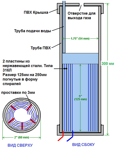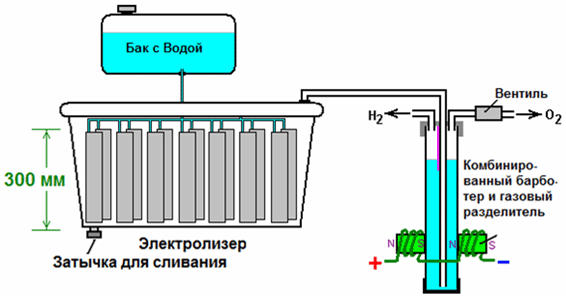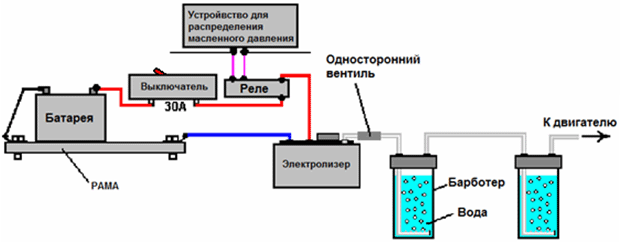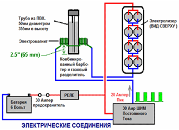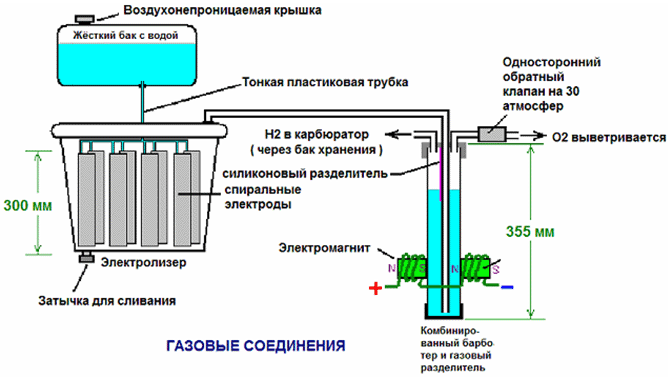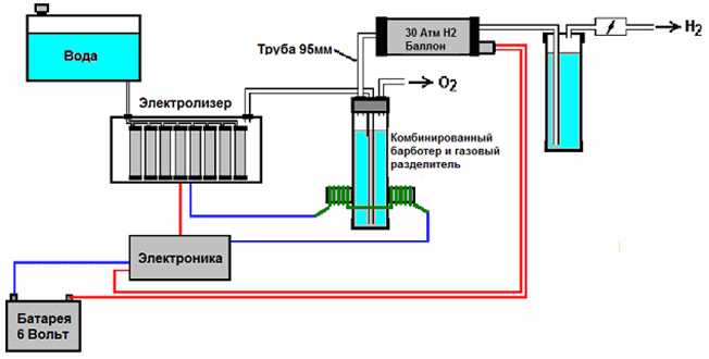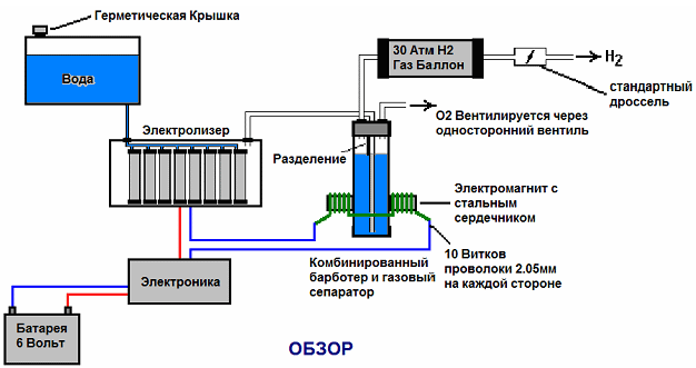 В свободной энергии нет ничего волшебного, и под «свободной энергией» я подразумеваю нечто, производящее выходную энергию без необходимости использовать топливо, которое вы должны купить. Зак Уэст из США может управлять своим 250-кубовым мотоциклом на воде. Строго говоря, он превращает воду в газ перед подачей в двигатель. Все компоненты, которые использует Зак, он сделал сам, и ни один из них не сложен в изготовлении. Устройство, используемое для превращения воды в газ, называется электролизером, и оно работает, пропуская электрический ток через воду. Лично я подозреваю, что электрическая система мотоцикла не способна полностью заряжать батарею мотоцикла при преобразовании воды в подходящее топливо, но использование 12-вольтовой системы должно преодолеть эту трудность. Метод, который использует Зак, несколько необычен, поскольку ему удается отобрать и выбросить большую часть кислорода, образующегося при превращении воды в газ. Это означает, что оставшийся газ в основном представляет собой водород, который гораздо менее реакционноспособен, чем НГО, который уже находится в идеальных пропорциях для объединения обратно в воду и, следовательно, обладает высокой реакционной способностью. Вместо этого полученный газ может быть достаточно хорошо сжат, и Зак сжимает его до 30 фунтов на квадратный дюйм (фунтов на квадратный дюйм) в контейнере для хранения. Это помогает при разгоне со стационарного на светофоре. Зак использует простую модульную конструкцию, в которой несколько пар спиральных электродов размещены внутри отдельной длины пластиковой трубы. Это конструкция, которую не сложно и не особенно дорого построить. В общих чертах, электролизер Зака питается водой из водяного бака, чтобы поддерживать его в доливе. Блок электролизера содержит несколько пар электродов, которые разделяют воду на водород и кислород при подаче импульсного электрического тока, генерируемого электроникой, которая питается от электрической системы мотоцикла. Газ, вырабатываемый электролизером, подается в барботер, который предотвращает любое случайное воспламенение газов, поступающих обратно в электролизер, и, кроме того, удаляет большую часть кислорода из газа, действуя в качестве «сепаратора» газа. Договоренность такая: ![]() Газообразный водород, выводимый из электролизера, не подается непосредственно в двигатель, а вместо этого поступает в напорный бак, в котором разрешено создавать давление до тридцати фунтов на квадратный дюйм до запуска двигателя. Большая часть кислорода, образующегося при электролизе, отводится через односторонний клапан на 30 фунтов на квадратный дюйм, который включен для поддержания давления внутри барботера (и электролизера) на уровне 30 фунтов на квадратный дюйм. Это давление будет чрезмерным для высокоэффективного электролизера, который производит HHO, который сильно заряжен электрически и поэтому самопроизвольно воспламеняется при сжатии из-за собственного электрического заряда. Однако в этом простом электролизере постоянного тока газ HHO смешивается с достаточным количеством водяного пара, который разбавляет его, и с пониженным уровнем кислорода, что обеспечивает сжатие до тридцати фунтов на квадратный дюйм. Система подачи воды работает благодаря тому, что герметичный резервуар подачи расположен на более в