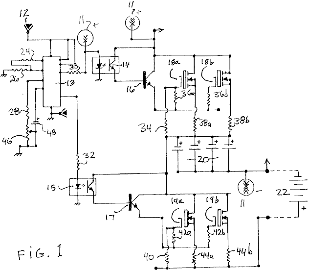 NPN 16, el primer juego de dos N-canal MOSFETs 18a y 18b, y sus resistencias