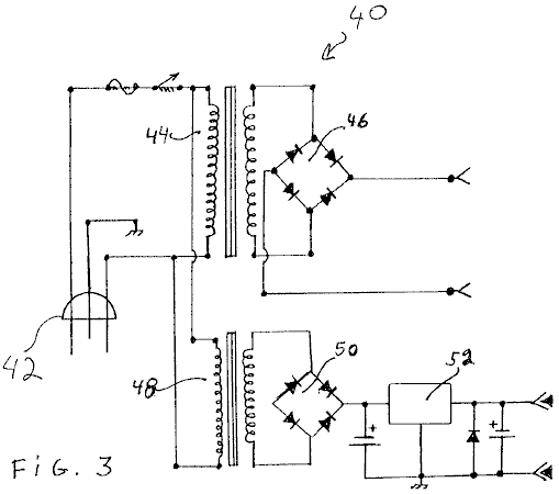 Un primer transformador 44 y rectificador de onda llena 46 forma el suministro